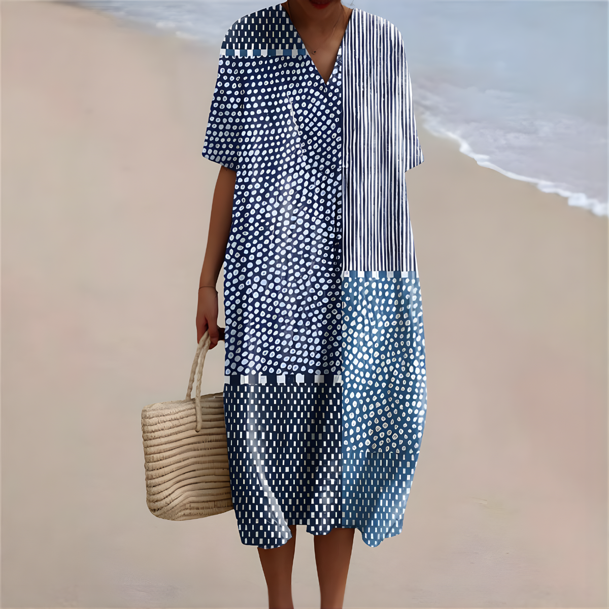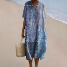 The Samira™ Blue Patchwork Breeze Summer Dress is your go-to piece for relaxed summer elegance. Designed with a calming blue patchwork pattern and a lightweight, flowing silhouette, Samira™ offers breathable comfort while adding a handcrafted, artistic feel to your everyday style. The soft V-neckline and loose midi fit move beautifully with you—perfect for warm days, seaside strolls, weekend outings, and effortless daily wear.