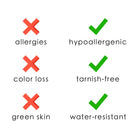 • Resistance: Water, sweat, and heat resistant (no tarnishing or discoloration)