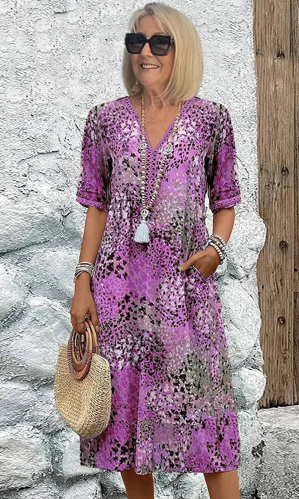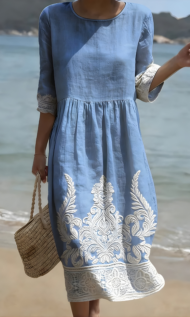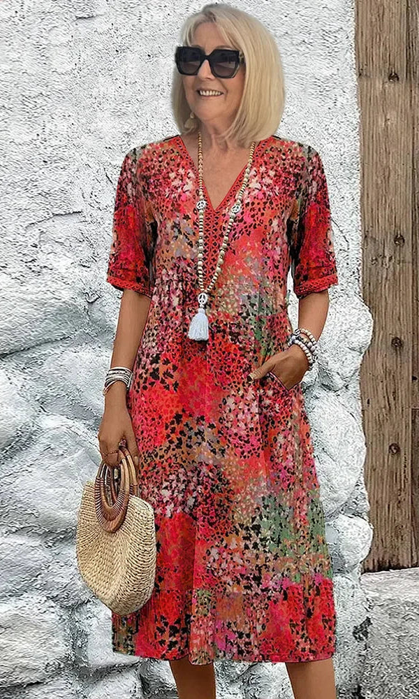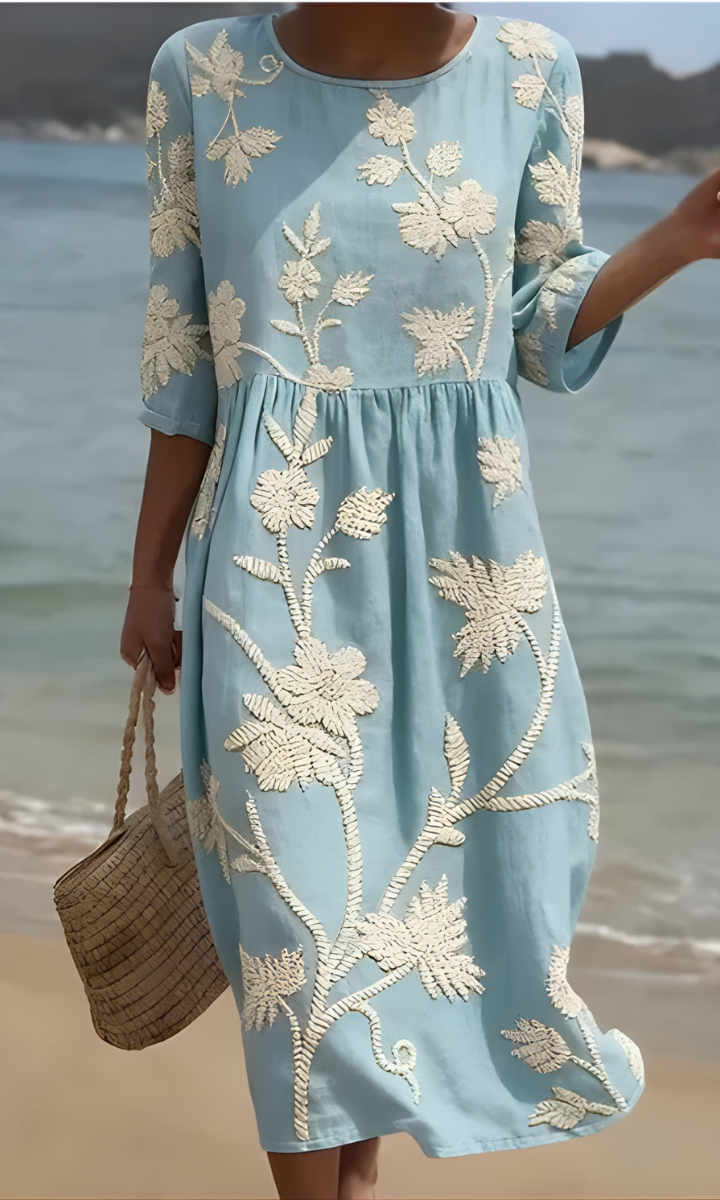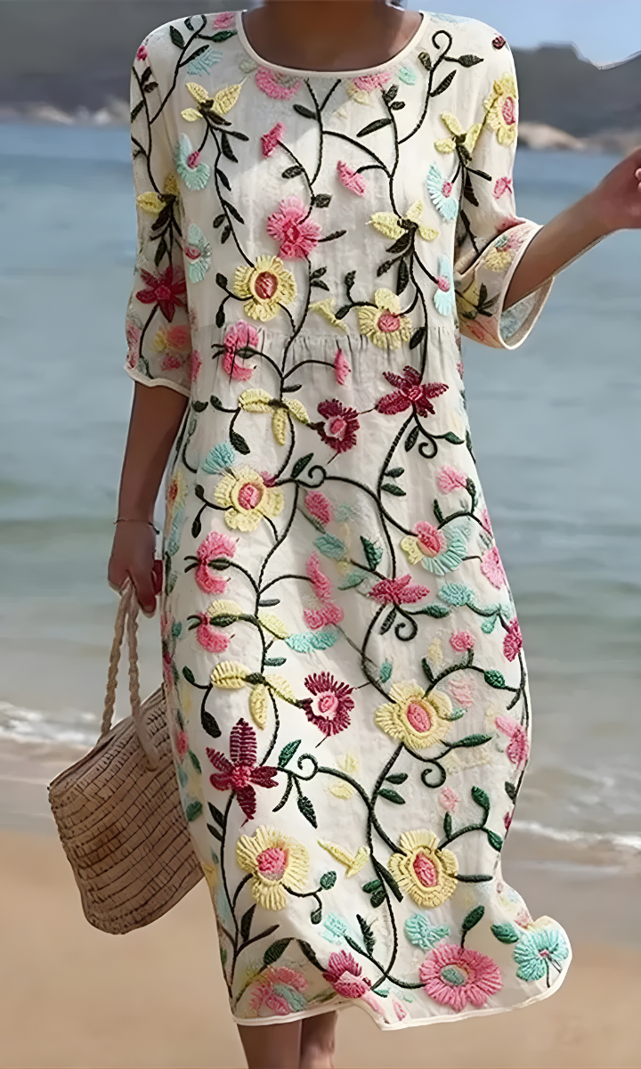 Our Cara™ Wildflower Midi Dress captures the beauty of a blooming meadow, featuring a soft grey base adorned with vibrant embroidered wildflowers in red, purple, and white. Designed for all-day comfort, this dress is made from lightweight, breathable fabric and offers a relaxed silhouette that moves with you. Perfect for seaside walks, casual lunches, or layering on cooler evenings, it’s a piece you’ll keep reaching for season after season.