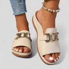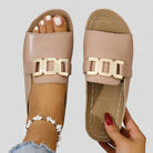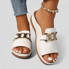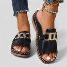 These slides bring a touch of luxury without sacrificing comfort. Featuring shiny metallic buckles and a sleek finish, they’re the perfect complement for any occasion.